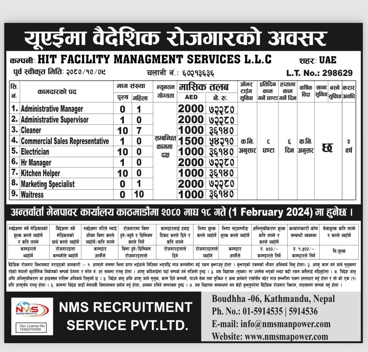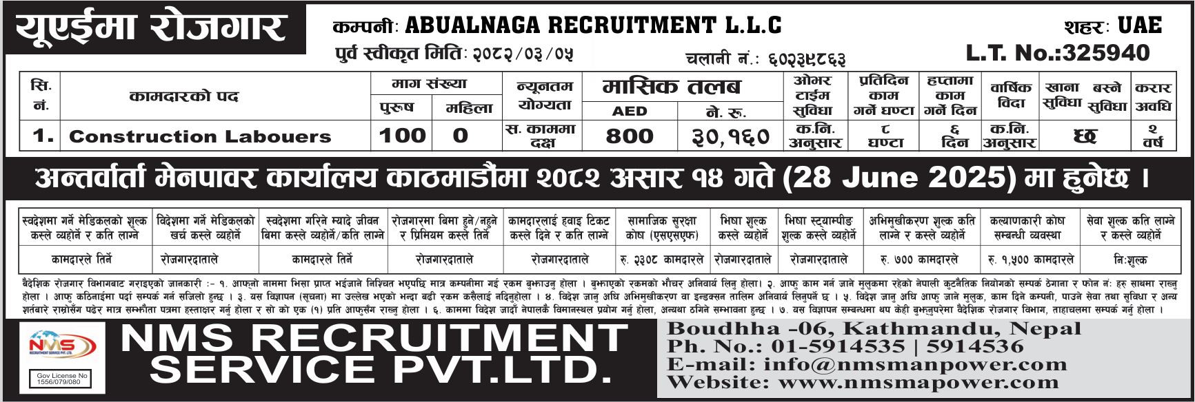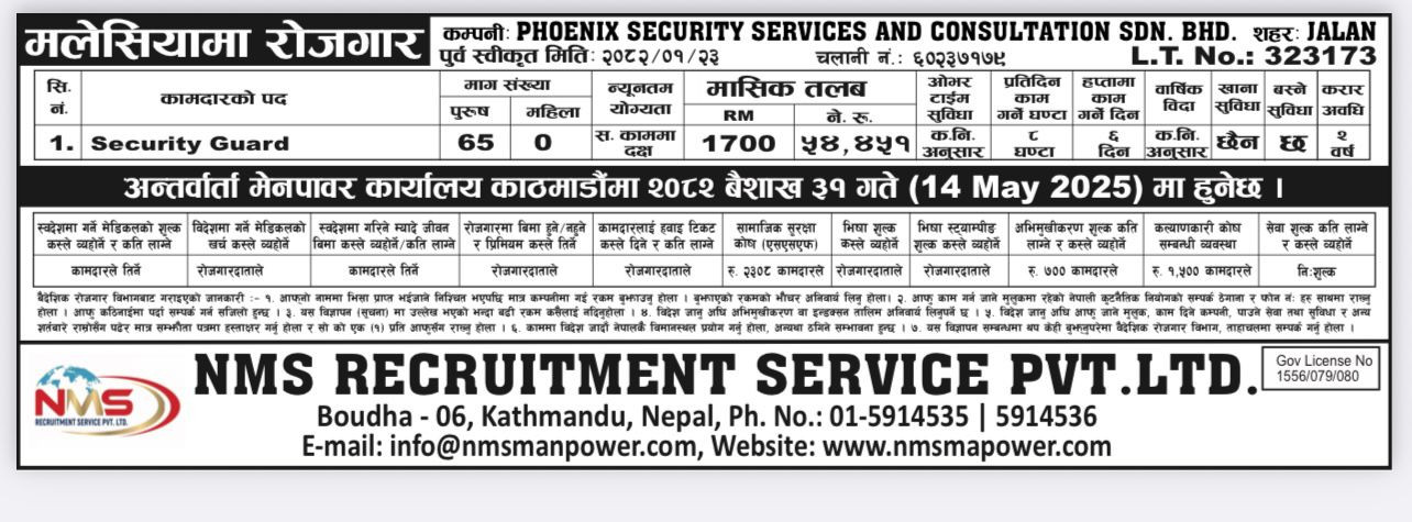 NMS Recruitment Service Pvt. Ltd. is a registered recruitment agency with Govt. License No.: 1556/079/080 based in Nepal. We have team of experienced professionals who are dedicated to providing high-quality recruitment services to clients globally with 10 years of recruitment experience.