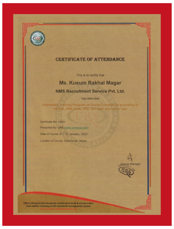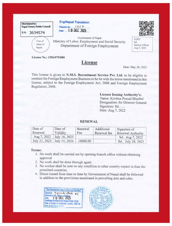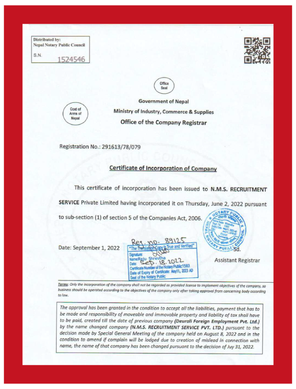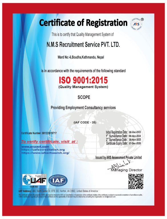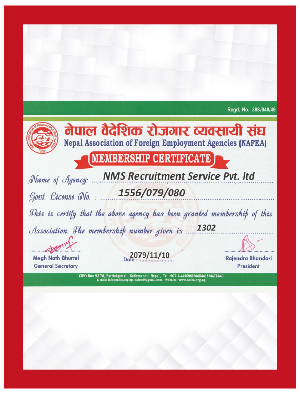 NMS Recruitment Service Pvt. Ltd. operates with full compliance and holds various legal certificates that reinforce our credibility and trustworthiness. These certificates provide evidence of our registration and licensing from the relevant government authorities. We are committed to conducting our business in accordance with the laws and regulations of Nepal. The following legal documents solidify our authenticity: